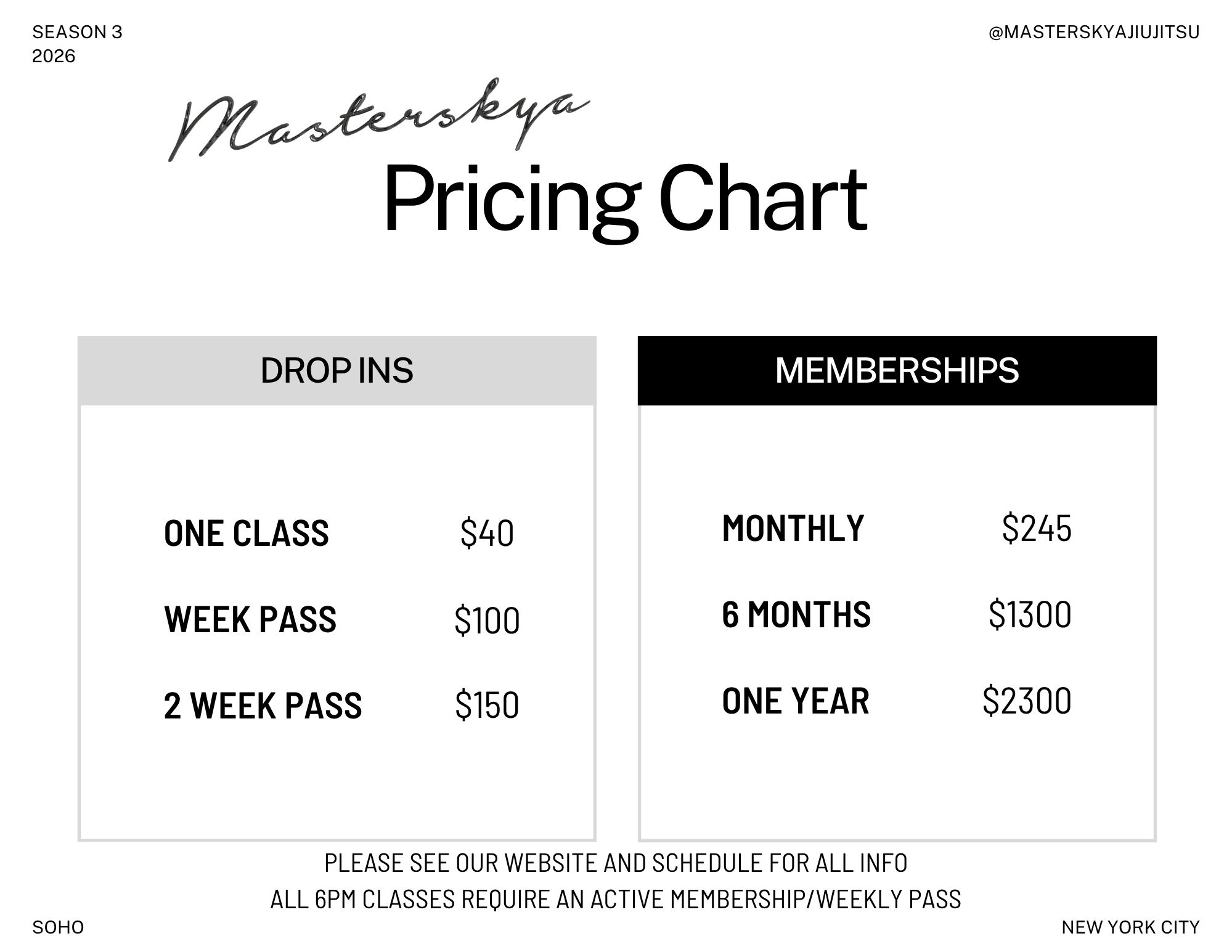 ● All students on memberships are grandfathered into their prices. If there is a cancellation and the membership is started less than 3 months of the cancellation, we will honor the previous price (in case there is an increase)
